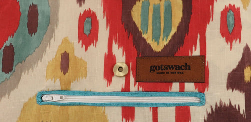 - Fully lined, Ivory, yellow, red, teal, brown southwest design